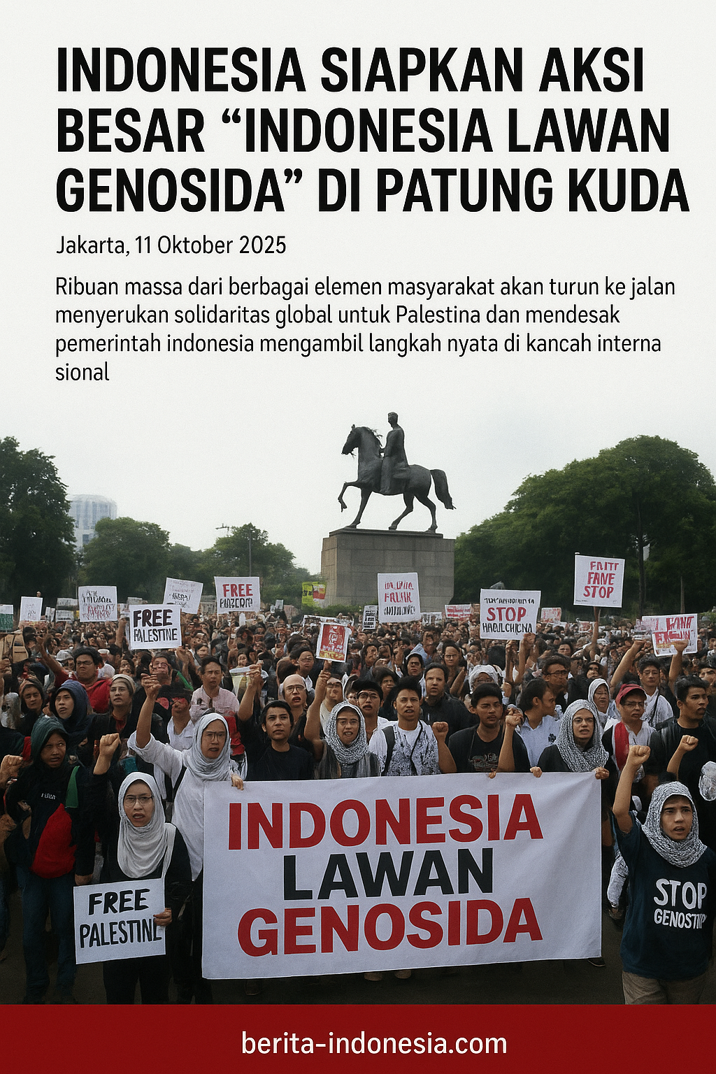 Jakarta, 11 Oktober 2025 – Sejumlah organisasi masyarakat, kelompok pemuda, dan mahasiswa hari ini mengumumkan akan menggelar aksi besar bertajuk “Indonesia Lawan Genosida” di kawasan Patung Kuda, Jakarta Pusat, Minggu (12/10).