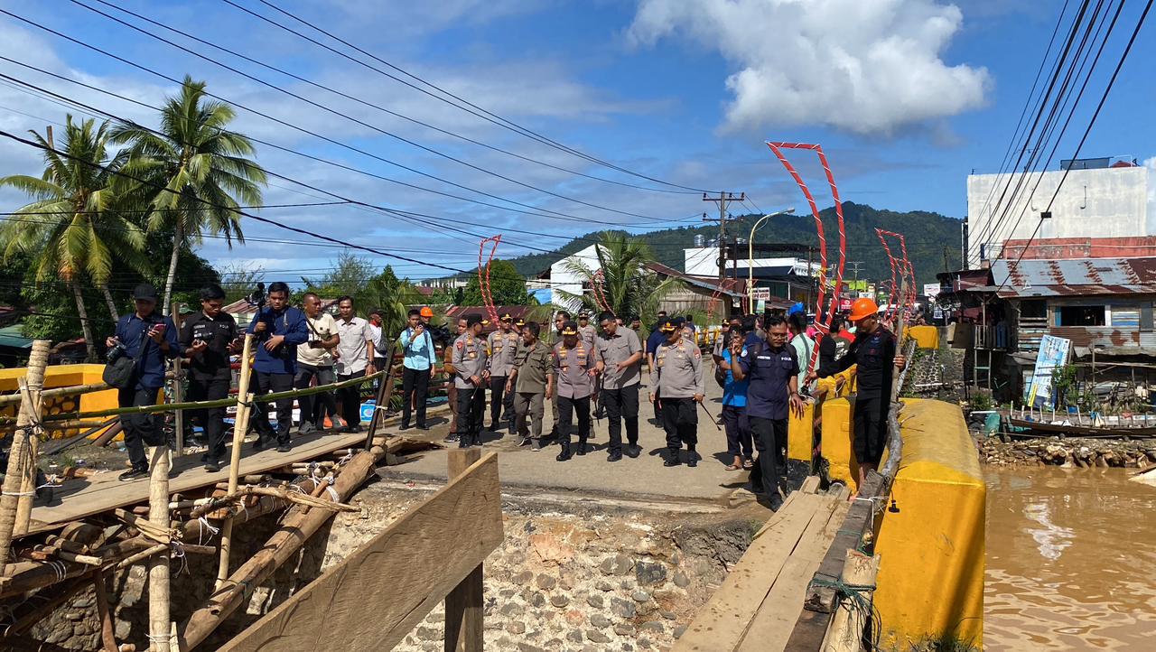 Sementara itu, Kapolri Jenderal Listyo Sigit Prabowo bersama Dankor Brimob Polri Komjen Pol Ramdani Hidayat, PJU Mabes Polri, serta Ketua Umum Bhayangkari melanjutkan peninjauan ke Jembatan Halangan, titik infrastruktur yang putus di Jalur Lintas Sibolga–Padang Sidempuan. Kapolri memastikan percepatan perbaikan jembatan serta menyerahkan bingkisan kepada warga di kawasan tersebut.