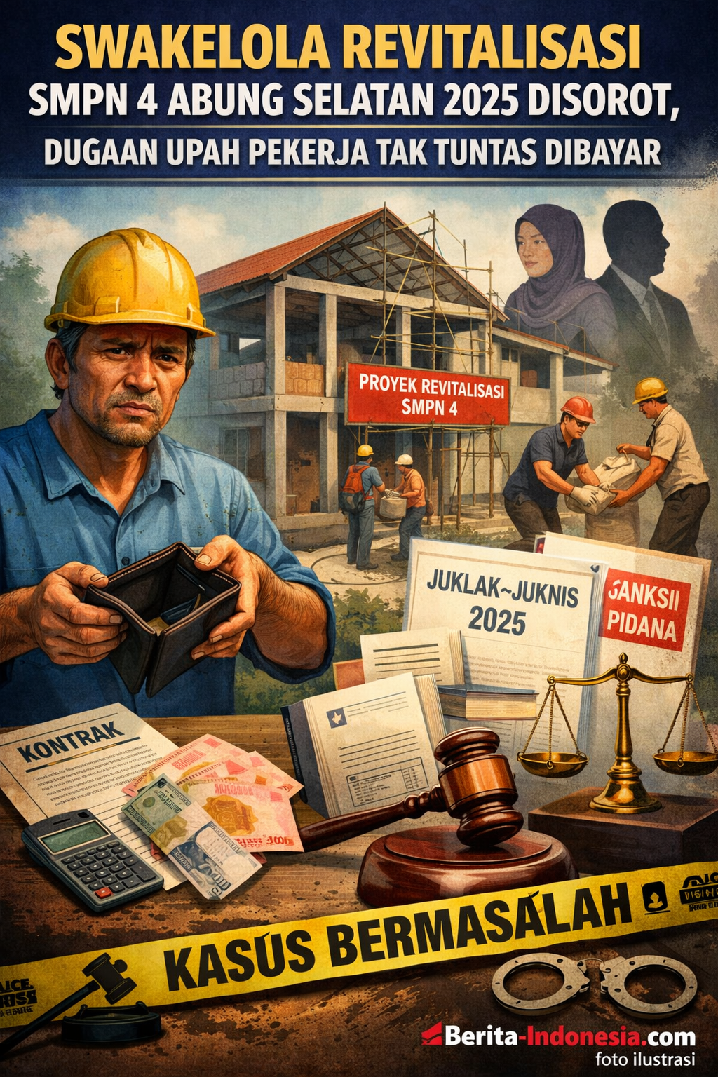 Lampung Utara – Pelaksanaan proyek swakelola revitalisasi Sekolah Menengah Pertama Negeri (SMPN) 4 Abung Selatan Tahun Anggaran 2025 di Kabupaten Lampung Utara tengah menjadi sorotan. Sejumlah persoalan mencuat, salah satunya dugaan belum tuntasnya pembayaran upah pekerja bangunan. Senin (12/01/2026).