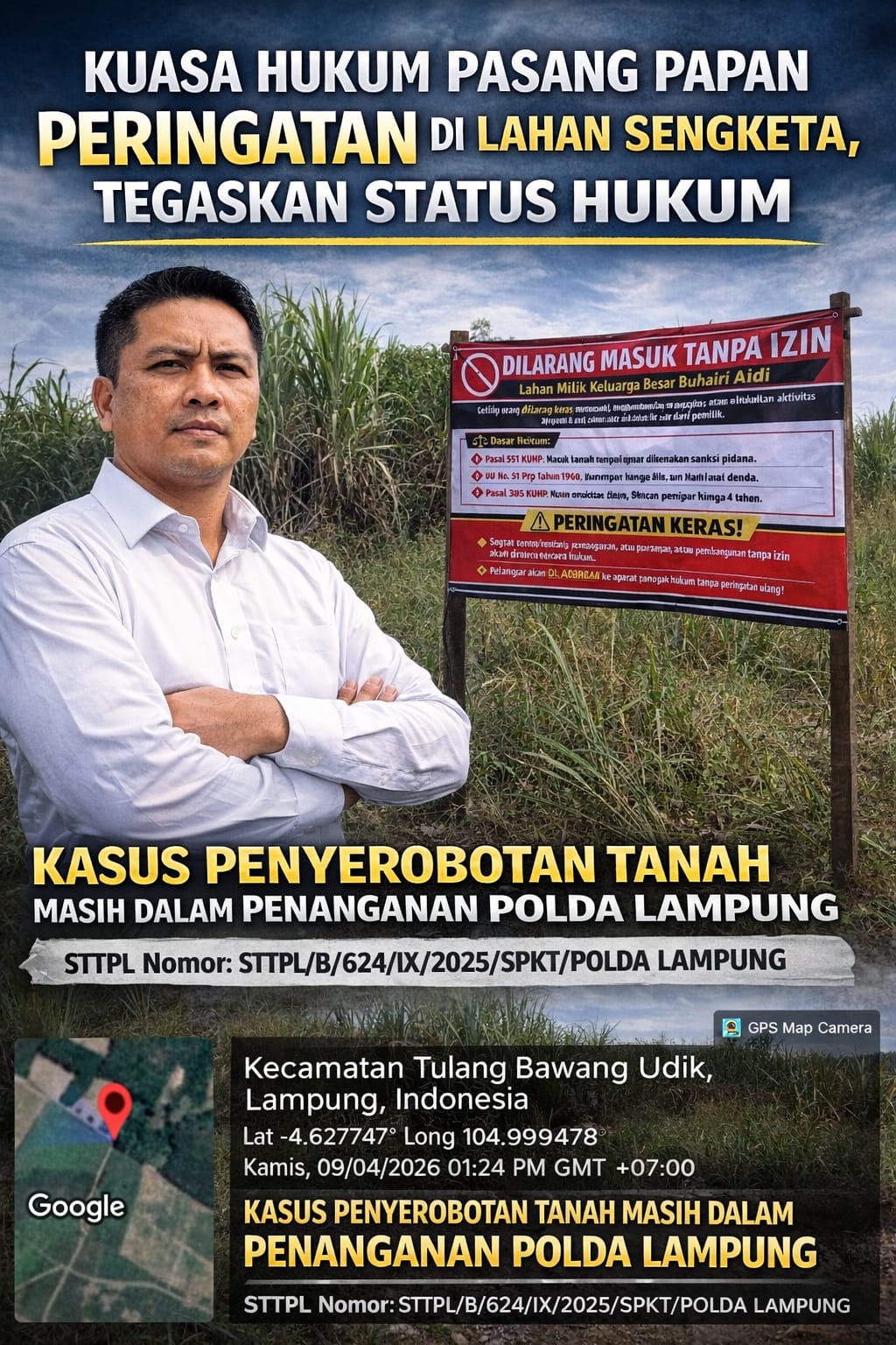 Pada Kamis, 9 April 2026, kuasa hukum Iko Erza Haritius selaku pelapor dalam perkara dugaan tindak pidana penyerobotan tanah, Septian Hermawan, S.H., menyampaikan bahwa pihaknya telah melakukan pemasangan papan peringatan langsung di lokasi sengketa.